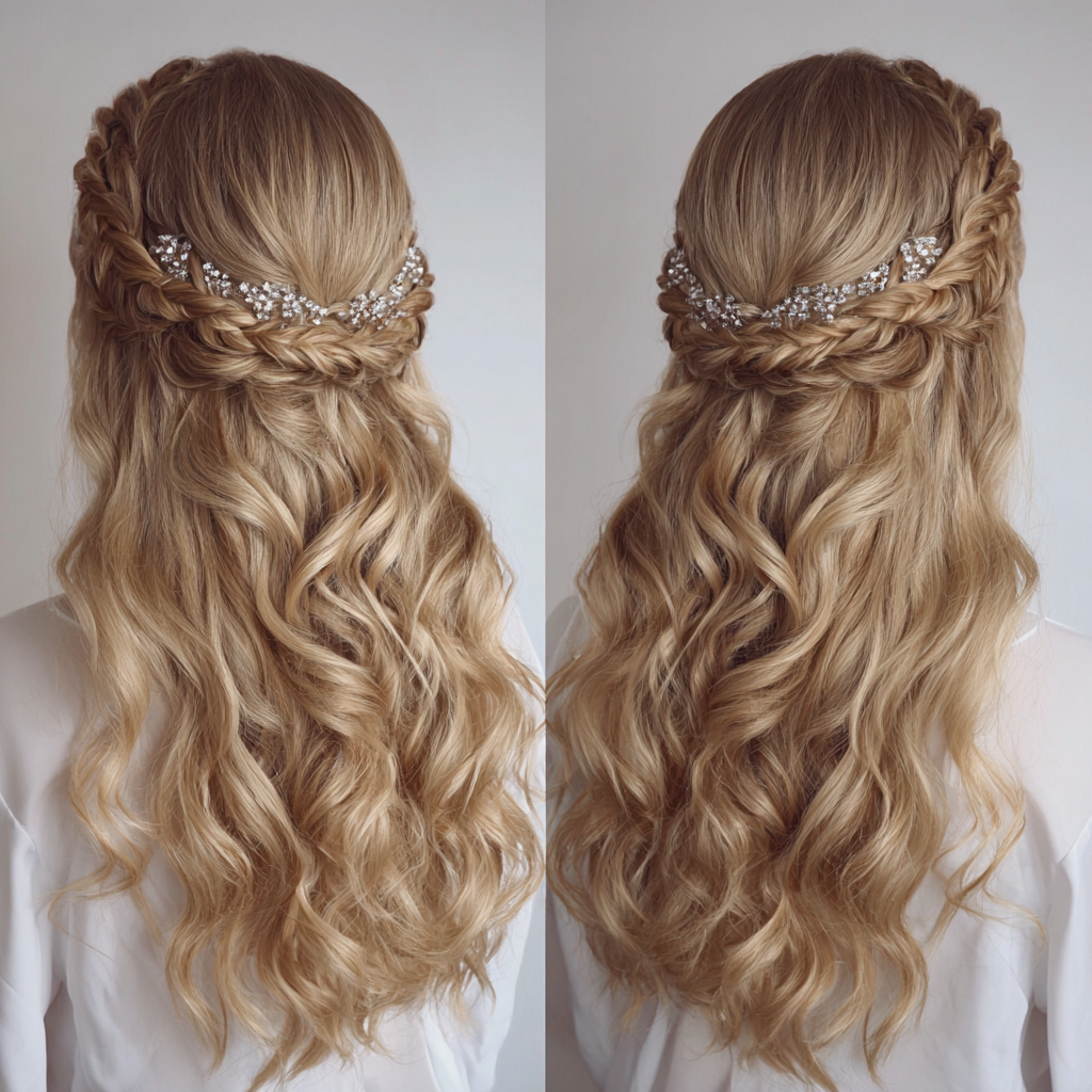 Get an ethereal and romantic Glam Hair look with braided headband coupled with flowing waves, ideal for those events where you have to feel like a fairy. Great as an Elegant Hairstyles For Wedding Guest or simply any romantic outing. This is a playful yet elegant style where you start by creating a braid that goes like a headband over your head, leaving your hair in delicate waves. This Glam Hair balances innocence with a touch of bohemian vibe, making it ideal for long wavy hair.